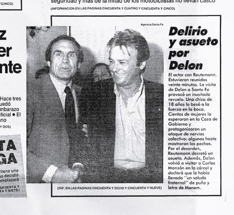 También ese 5 de agosto de 1993, un rato antes, Delon visitó en la Casa Gris al entonces gobernador Carlos Reutemann. Ambos mantuvieron un encuentro “cercano a 40 minutos”.