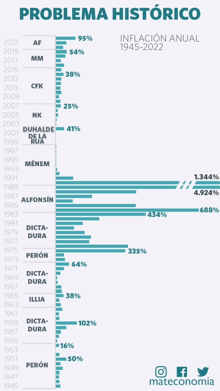 DN: Sin pretender sacar conclusiones sobre algo tan complejo como la inflación en Argentina, está claro que tenemos un problema estructural irresuelto. Veo ese gráfico y lo primero que me digo es que hay que desconfiar de los que te hablan con tanta liviandad de que la solución es esta o es otra. Mirá que pasaron gobiernos y ministros de economía en estos 78 años.