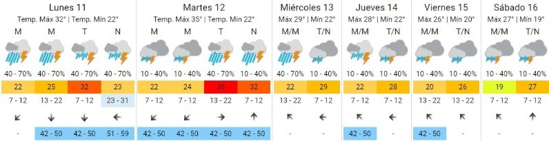 Según el SMN, desde el martes al próximo sábado las precipitaciones estarían presentes durante todo el día. Por otro lado, por el momento no bajaría la temperatura, por lo que se mantendría con mínimas de 25 grados y máximas que superan los 30.