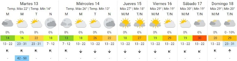 Si bien se espera un ascenso paulatino con el correr de los días, habrá tiempo estable y con cielo de algo a parcialmente nublado para miércoles (13º/26º), jueves (18º/27º) y viernes (19º/29º). Luego de esa semana corta, sábado y domingo llegarían con tardes que rondarán los 30º.