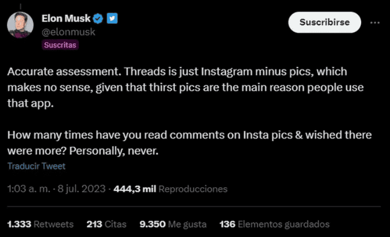 “Evaluación precisa. Threads es solo Instagram sin fotos, lo cual no tiene sentido, dado que las fotos son la razón principal por la que las personas usan esa aplicación. ¿Cuántas veces has leído comentarios sobre fotos de 'Insta' y deseaste que hubiera más? Personalmente, nunca”, tuiteó el multimillonario.