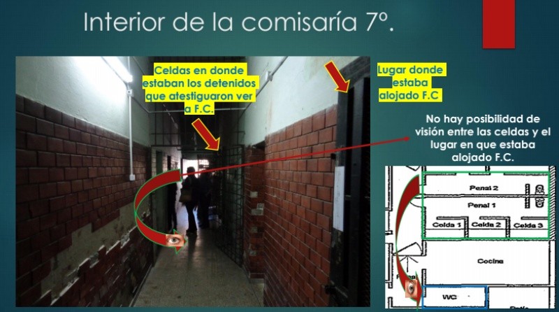 También expuso un croquis con fotos de la comisaría para afirmar que los presos en las celdas normales no podrían haber visto lo que ocurrió en “La Jaulita”.