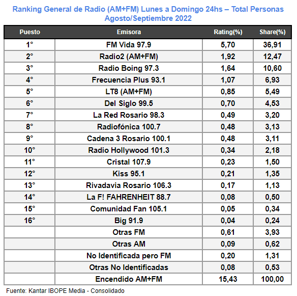 En el ranking general de radios, de lunes a domingo y las 24 horas del día, FM Vida se ubica en el primer puesto, con un encendido (share) del 36,91%. Le sigue Radio 2 (AM 1230 más FM 90.1), con el 12,47%, que es la radio de contenido periodístico informativo más elegida. En cuarta ubicación aparece Frecuencia Plus, con el 6,93%. O sea que, de las cuatro emisoras más escuchadas de la ciudad y la región, tres son del Grupo Televisión Litoral. Este “power trío” se lleva el 56,31% del encendido. Un número realmente impresionante e histórico para la radiofonía local y también del interior del país.