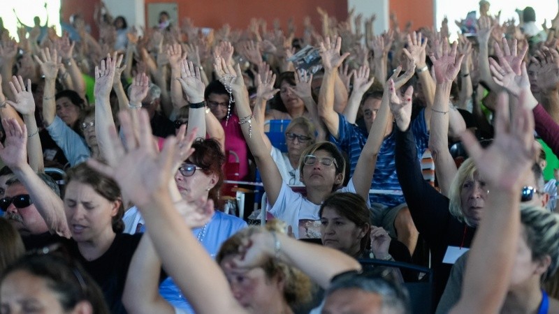 “Son unos revoltosos”. Leda Bergonzi se ríe desde el escenario, micrófono en mano. Les habla a unas 2000 personas congregadas el martes pasado en el camping del sindicato de Recolectores de residuos de Rosario (San Martín al 7200) que, tras una hora y media de oración y prédica evangélica, quieren tocarla, abrazarla, decirle “Ledi te amo”. Precisan mostrarle a esta mujer a la que le asignan "milagros” las fotos de sus seres queridos ávidos de Dios. Ella intenta ordenar la demanda y evitar roces con palabras de contención: “Voy a abrazar a todos”.
