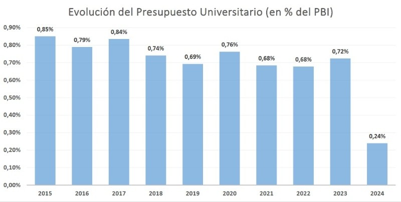 Asimismo, desde el IEC estimaron que "de persistir esta tendencia, al concluir el año se habrá destinado a la educación universitaria tan solo el 0,24 por ciento del Producto Bruto Interno, el valor más bajo de las últimas décadas (a título ilustrativo: en los últimos años estuvo en torno al 0,70%)".