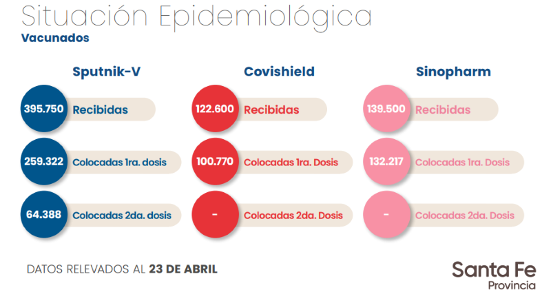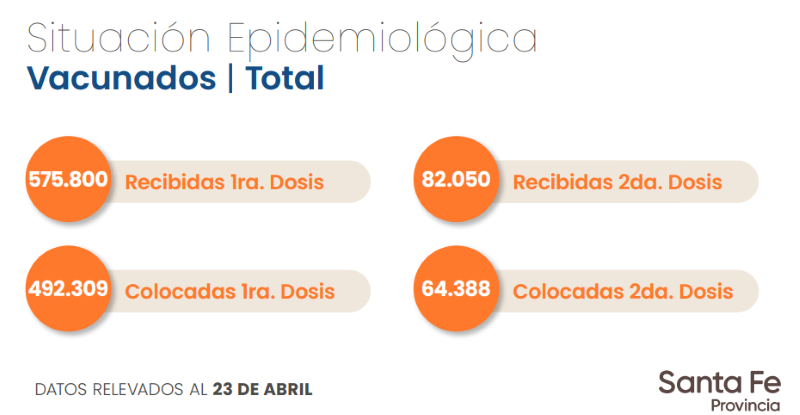 Según las cifras oficiales de Nación hasta este viernes, Santa Fe recibió 657.850 dosis y ya aplicó 540.245. La primera dosis alcanzó a 492.309 mientras que 64.388 ya tienen ambas.