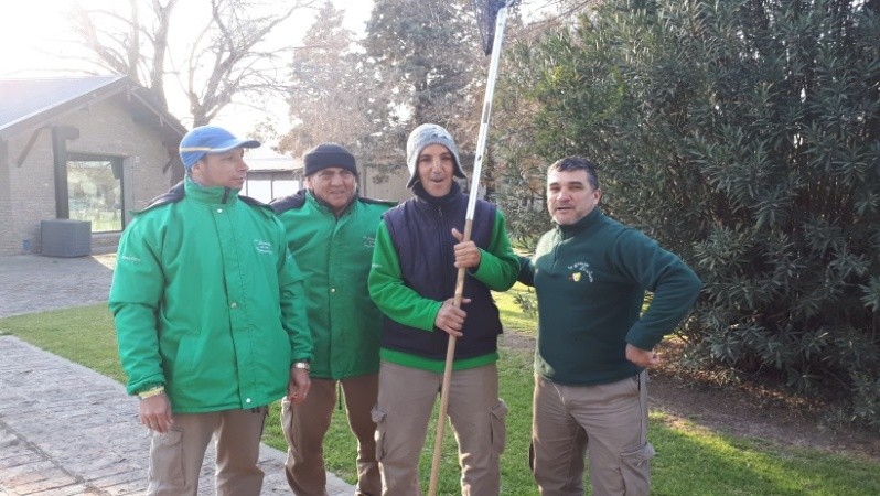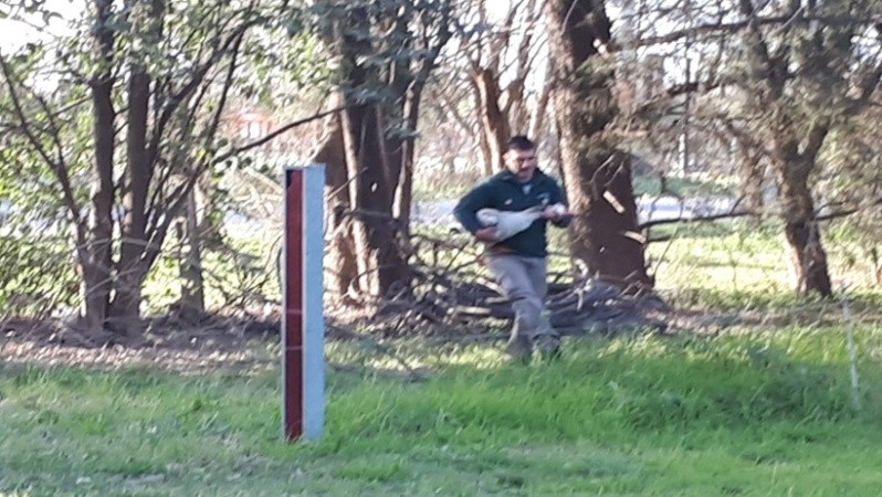 Más tarde se presentaron tres compañeros más con el “palo bolsa”. Y empezó el “operativo rescate”. La gansa se dio cuenta enseguida de sus intenciones y se echó a volar. También apuró el paso y complicó la tarea. Pero, Fabián tiene 30 años de experiencia y se lució: fue arrinconándola hasta dejarla contra un enrejado y la tomó con ambas manos.
