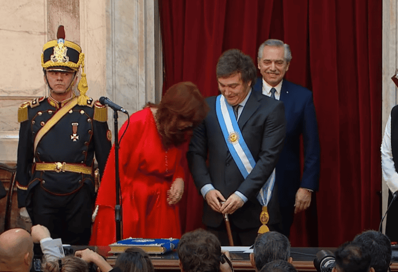 ¿Es un león o son perros? Javier Milei recibió la banda presidencial y el bastón de mando de Alberto Fernández.