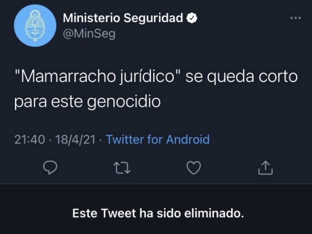 Sabina Frederic respaldó los dichos del ministro retuiteando sus frases en su red social personal. No obstante, desde el Ministerio de Seguridad, luego de borrar la fallida publicación, explicaron que “por un error involuntario se publicó un tuit personal en la cuenta institucional del Ministerio”. “Se han tomado las medidas correspondientes, pedimos disculpas por el caso”, se agregó.
