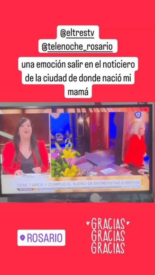 El video en cuestión, donde se la ve a ella junto a la conductora, se compartió en Telenoche (El Tres), entre tantos medios nacionales. Rápidamente, agradeció a través de su cuenta de Instagram, haber salido en el noticiero de Rosario y remarcó su afinidad: "Una emoción salir en el noticiero de la ciudad donde nació mi mamá".