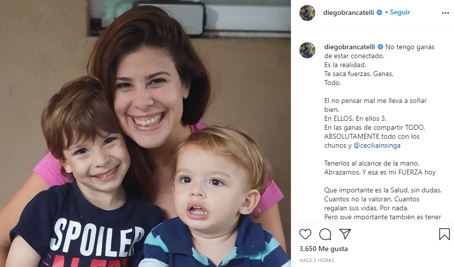En su Instagram, Brancatelli publicó una foto de su mujer Cecilia Insinga, junto a los hijos de ambos y un texto sobre su situación en la internación.