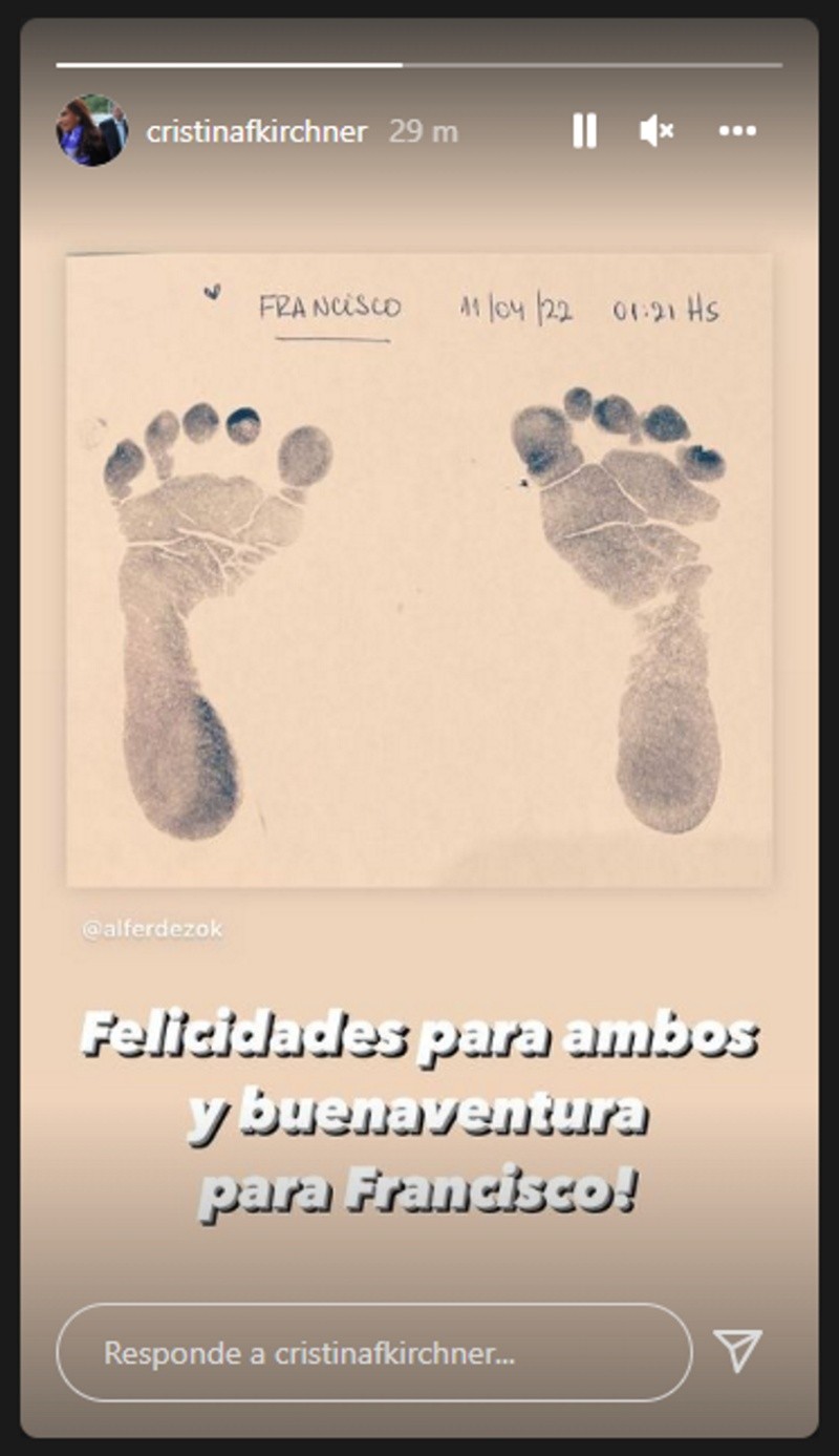La vicepresidenta Cristina Fernández saludó este lunes al presidente Alberto Fernández y la primera dama, Fabiola Yañez, por el nacimiento de Francisco, el hijo de ambos, a quien le deseó "buenaventura".