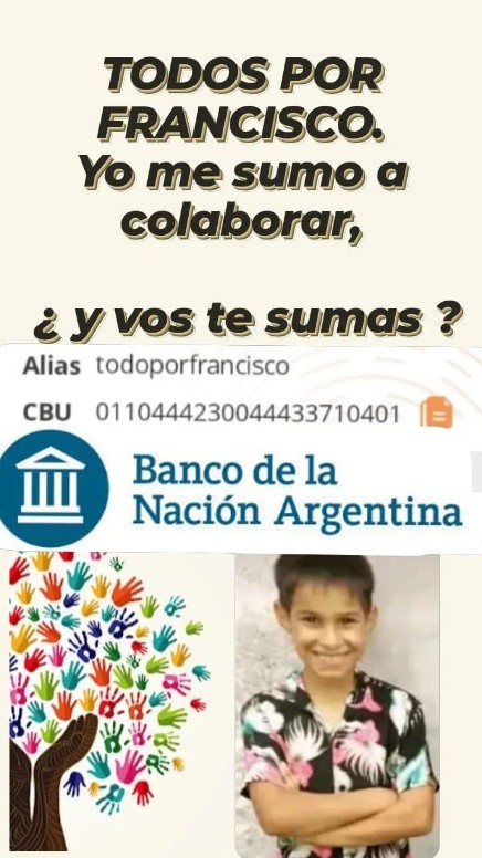 En paralelo con las donaciones físicas, también sigue activa la posibilidad de donar dinero a una cuenta del Banco Nación a nombre de Daniela Alejandra Lemo, madre del menor herido. Para colaborar el alias es: Todoporfrancisco y el CBU: 0110444230044433710401