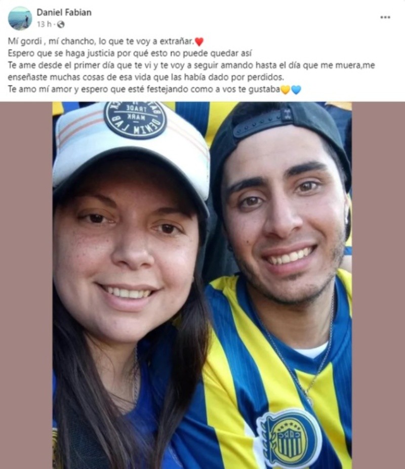 El asesinato de Ivana Paula Garcilazo Bellón, la hincha de Rosario Central a la que le dieron un piedrazo en la cabeza este sábado por la tarde noche en inmediaciones del Coloso Marcelo Bielsa, generó un gran dolor entre sus familiares. Tras el trágico hecho su pareja, Daniel Fabian, escribió un emotivo mensaje para despedirla y pedir justicia tras lo sucedido el día del clásico rosarino.