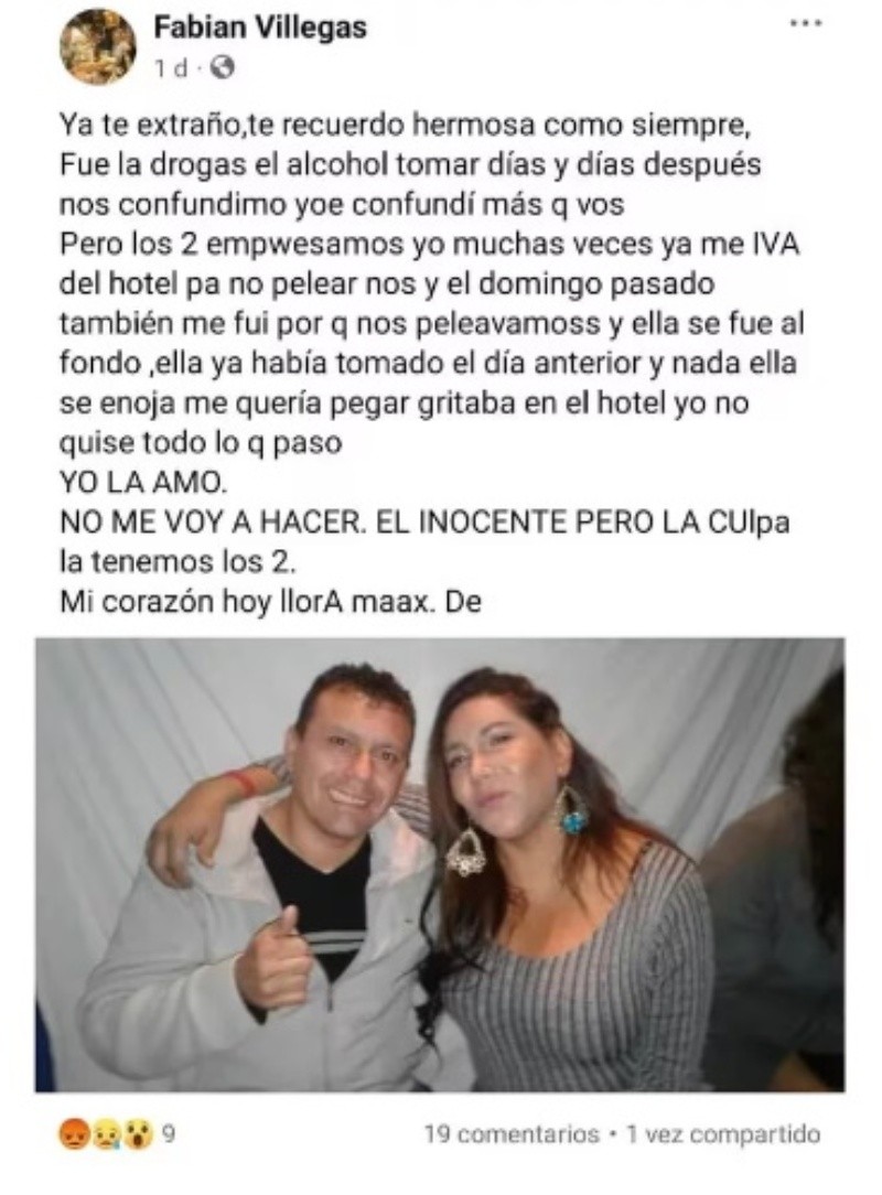 "No me voy a hacer el inocente, pero la culpa la tenemos los dos. Mi corazón hoy llora", publicó Fabián Villegas (38) en Facebook, el pasado sábado a las 23.32, un horario en el que supuestamente ya estaba detenido por el asesinato de López García (47).