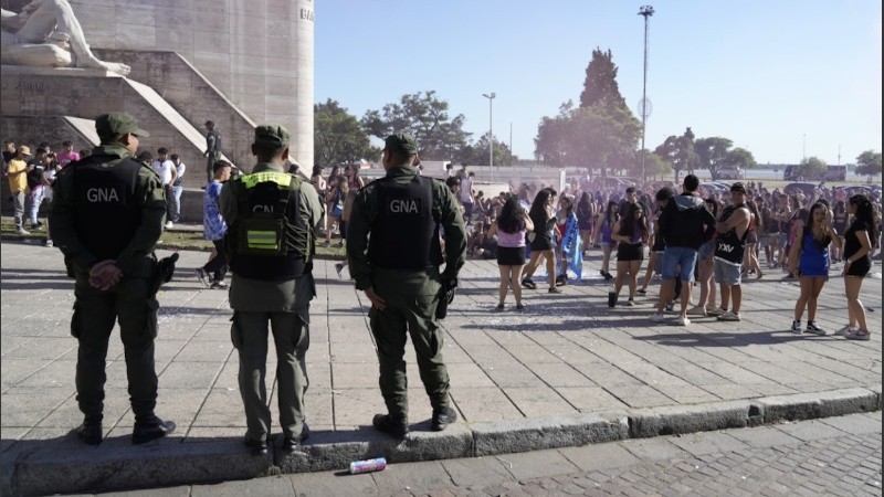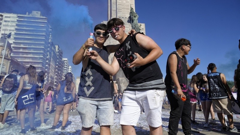Con la presencia de la secretaría de Control y Convivencia y de fuerzas de seguridad en las inmediaciones del Monumento, los chicos aprovechaban las últimas horas de jolgorio. “Festejamos que pasamos a quinto, aunque algunos lo estamos intentando”, lanzó un adolescente en Radiópolis. Al parecer le quedan varias materias para lograrlo.