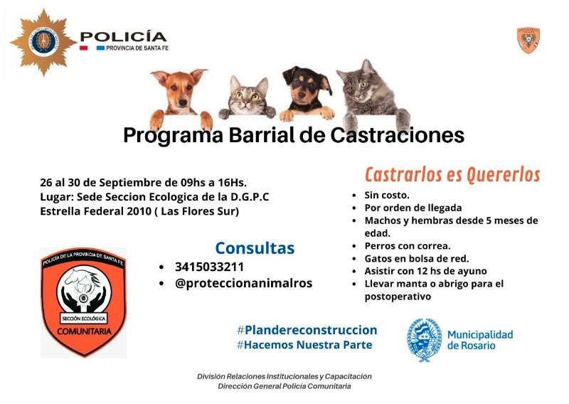 El programa “Castrarlos es quererlos”, organizado por la Municipalidad de Rosario y con la participación de veterinarios, comenzó este lunes en barrio en las instalaciones de Estrella Federal al 2010, sede de la Sección Ecológica de la Policía Comunitaria.
