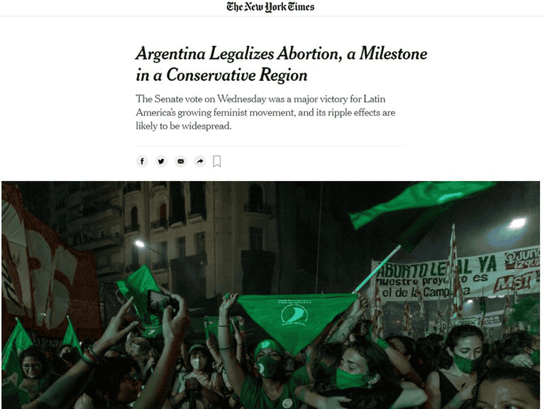 Según Infobae, el diario estadounidense The New York Times destacó que Argentina legalizó el aborto, lo que consideró un “hito en la región conservadora”: “La votación del Senado el miércoles fue una gran victoria para el creciente movimiento feminista de América Latina, y es probable que sus efectos se extiendan”.