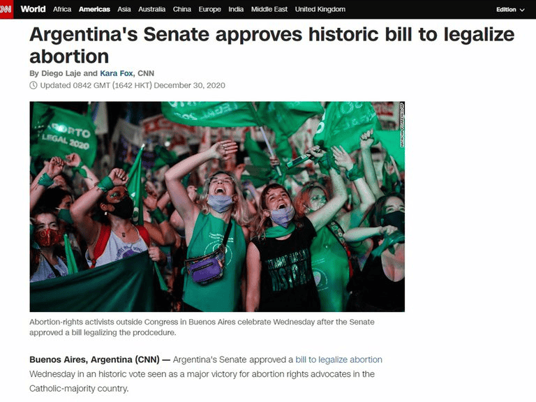 CNN señaló que el Senado argentino aprobó un “histórico proyecto de ley para legalizar el aborto” en “una votación histórica considerada como una gran victoria para los defensores del derecho al aborto en el país de mayoría católica”.