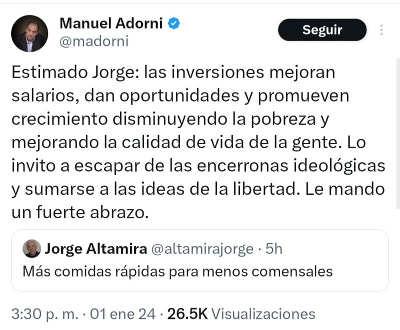 Evidentemente, tampoco supo todo esto Manuel Adorni, quien le respondió a Altamira como si realmente llegasen empresas con dólares desde el norte: "Las inversiones mejoran salarios, dan oportunidades y promueven crecimiento disminuyendo la pobreza", le escribió.