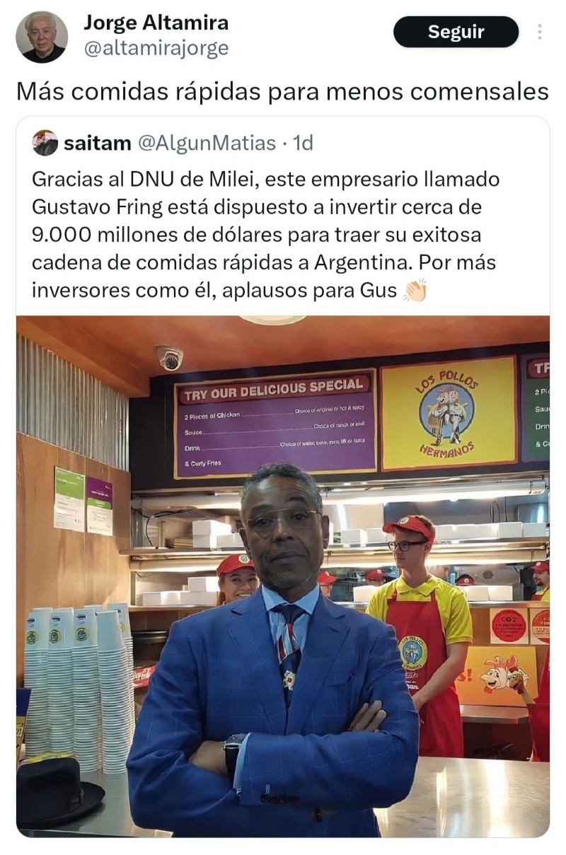 Todo inició cuando la cuenta @AlgunMatias posteó un chiste sobre posibles inversiones de la cadena Los Pollos Hermanos, de Gus Fring. A ello se sumó, el referente histórico del Polo Obrero, que evidentemente nunca vio la serie Breaking Bad: "Más comidas rápidas para menos comensales", escribió el ex legislador de 81 años.