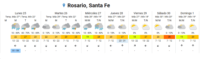 El SMN indicó además que será una semana inestable con lluvias al menos hasta el miércoles por la noche. Luego a partir del jueves se esperan solo días nublados y de mucho calor, temperaturas acordes al inicio del mes de diciembre.