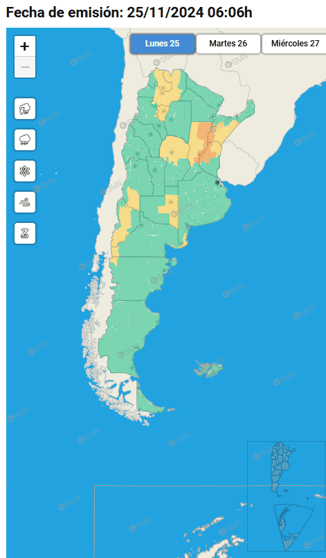 El Servicio Meteorológico Nacional (SMN) había emitido doble alerta naranja y amarilla, pero a primeras horas de hoy, solo era para el centro y norte de la provincia.