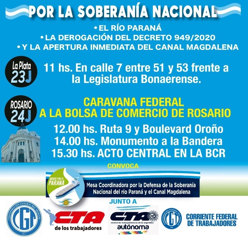 “La jornada está enmarcada en el reclamo por la recuperación del Río Paraná para la Argentina, la derogación del decreto 949/20 y la apertura inmediata del Canal Magdalena, y en ella confluirán caravanas locales con las provenientes de Buenos Aires y el litoral argentino”, señalaron los organizadores.
