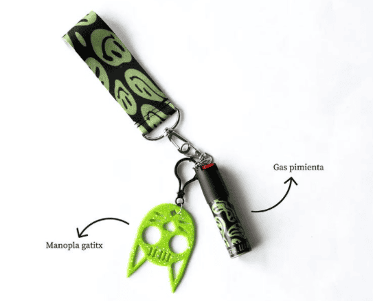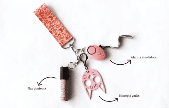 Los kits que ofrecen son tres. Uno compuesto por gas pimienta, con un alcance de casi 2 metros, se tira directo a los ojos del agresor y manopla en forma de gato que sirve como rompevidrio y cortacintones unido por el strap, es decir una cinta sublimada de agarre para usar de llavero.