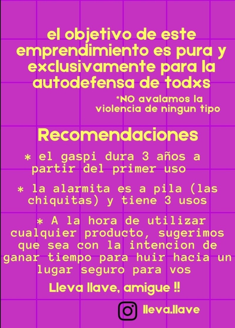 Victoria cuenta que luego de cada venta Lleva llave adjunta un mensaje donde se hace hincapié en que el kit solo para ser usado cuando la persona corre riesgo ya que de ninguna manera avalan la violencia.