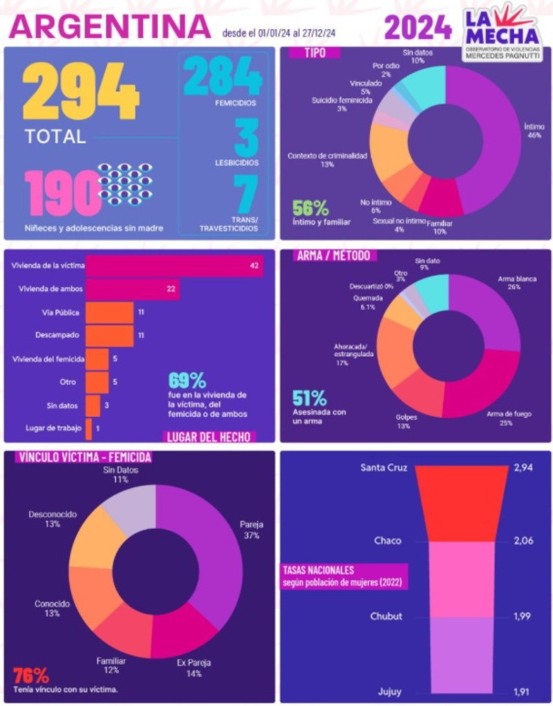 Las provincias con las tasas de femicidios más altas fueron Santa Cruz, Chaco, Jujuy y Chubut. De ese análisis, se desprende que 190 niñeces y adolescencias quedaron sin madre.