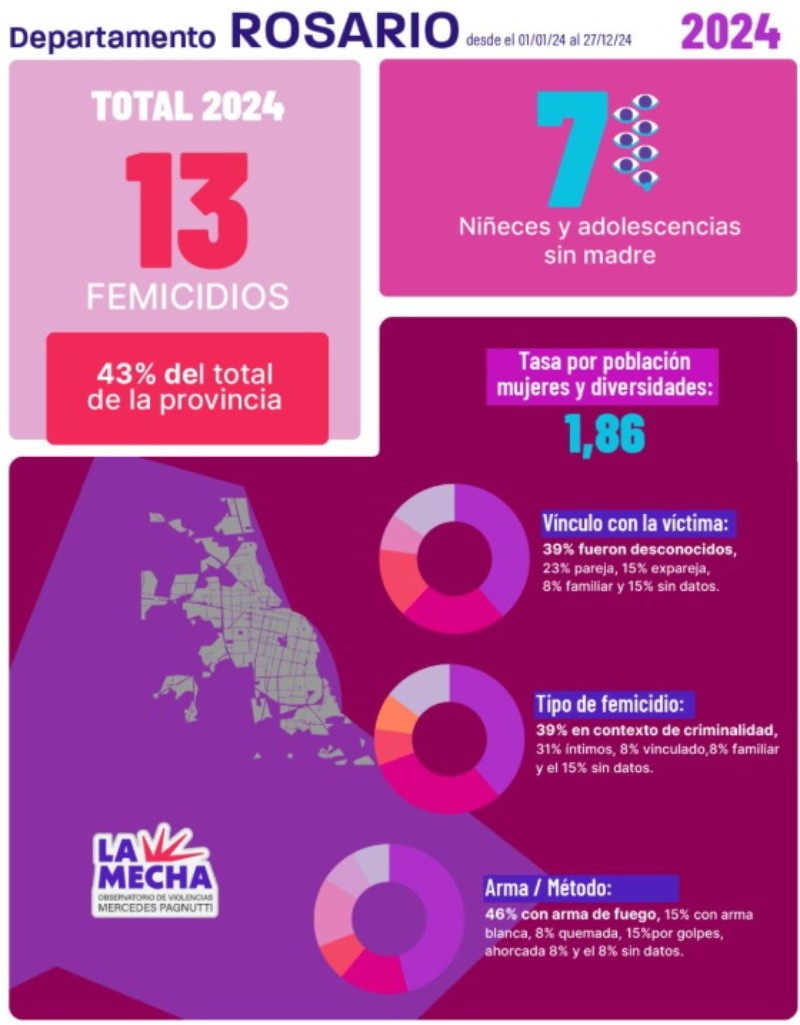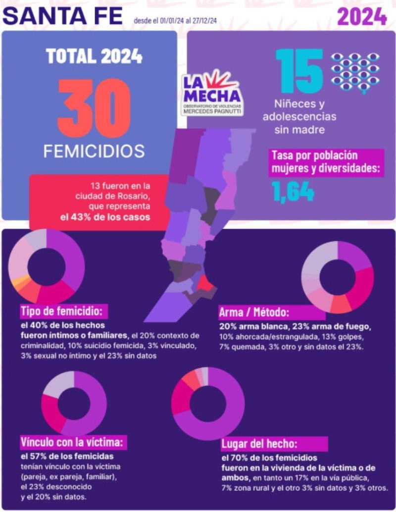 Según datos relevados por el Observatorio de Violencias Mercedes Pagnutti, entre enero y diciembre del 2024 se registraron 294 femicidios en el territorio nacional. En la provincia de Santa Fe, hubo 30 femicidios, de los cuales 13 ocurrieron en la ciudad de Rosario.