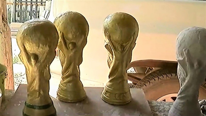 El Tres mostró desde su taller todo el procedimiento: el “Paisa”, como se conoce al autor de las obras, tenía una copa de yeso con la que hizo un molde y allí ingresa hormigón durante un día para sacar una robusta copia del trofeo de la FIFA.