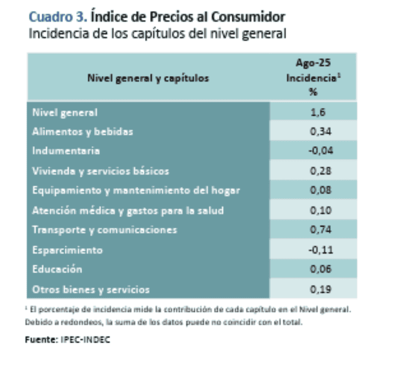 En lo que respecta a la incidencia de las distintas categorías en la construcción del 1,6% de inflación, “Transporte y comunicaciones” aportó un 0,74% del total mientras que “Alimentos y Bebidas” un 0,34%.