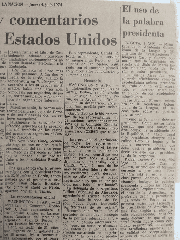 La nota del 4 de julio de 1974 citaba la opinión de la Academia Colombiana de la Lengua que señalaba que “la expresión correcta” era “presidenta”.