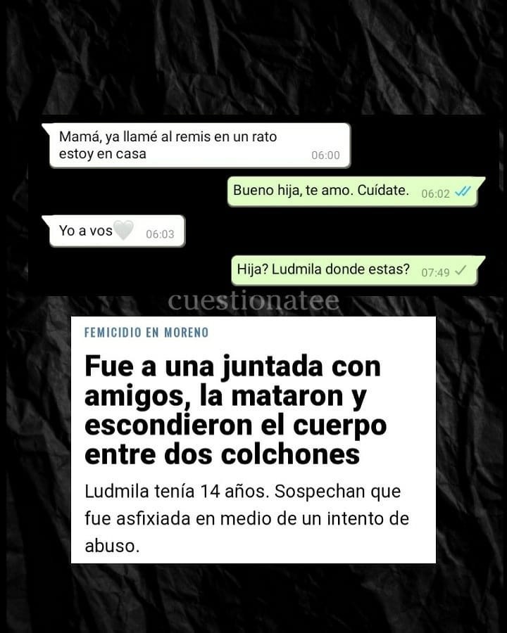 Con la foto de una mujer levantando un cartel que simula ser el chat de Whatsapp de alguien donde puede leerse las frases "Avisame cuando llegues" y "Amiga, ¿llegaste?", comienza la publicación que realizó este viernes la cuenta de Instagram Cuestionatee. La secuencia de imágenes se vuelve escalofriante porque pueden leerse las conversaciones que tuvieron las víctimas minutos antes de ser abusadas y asesinadas en manos de uno o muchos hombres. Enseguida comenzó a viralizarse.