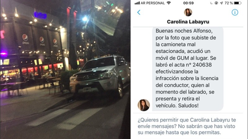 Alfonso, el usuario que subió la fotografía a sus redes, compartió también el mensaje que la secretaria de Control y Convivencia Carolina Labayru le envió después del procedimiento donde se constató la infracción. En él le informaba que "acudió un móvil de la GUM (Guardia Urbana Municipal) al lugar" y "se labró el acta" correspondiente para efectivizar "la infracción sobre la licencia del conductor".