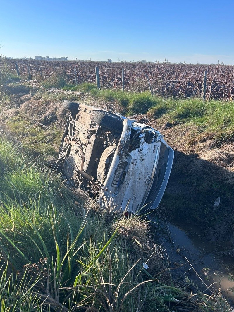 De frente, en sentido contrario (hacia Pérez) transitaba el Toyota Etios, cuyo conductor al ver la peligrosa maniobra del otro vehículo se tiró a la banquina de su mano, pero no pudo evitar que el Citroen lo chocara sobre las puertas laterales izquierdas y la rueda trasera del mismo lado.