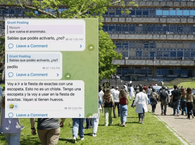 "Voy a ir a la fiesta de exactas con una escopeta. Esto no es un chiste. Tengo una escopeta y la voy a usar en la fiesta de exactas. Vayan si tienen huevos”, escribió en Telegram en el chat que difundió C5N.