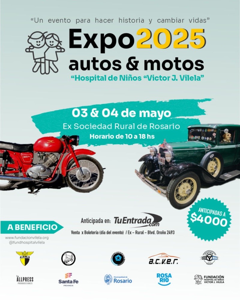 Este sábado 3 y domingo 4 de mayo se realiza en la Ex Rural de Rosario la Expo autos y motos 2025, para poder disfrutar en familia y, lo más importante, colaborar con el Hospital de Niños Víctor J. Vilela de la ciudad. La entrada tiene un costo de cuatro mil pesos y todo lo recaudado será destinado al hospital.