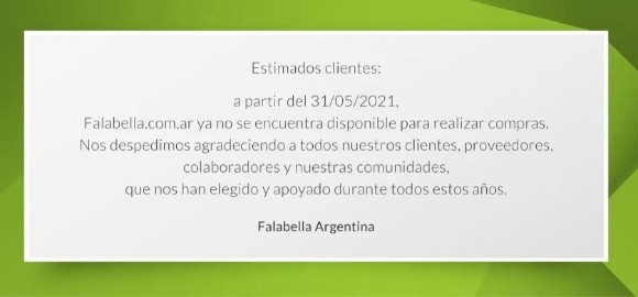 "Estimados clientes: a partir del 31/05/21 Falabella.com.ar ya no se encuentra disponible para realizar compras. Nos despedimos agradeciendo a todos nuestros clientes, proveedores y comunidades que nos han elegido y apoyado durante todos estos años" dice el comunicado.
