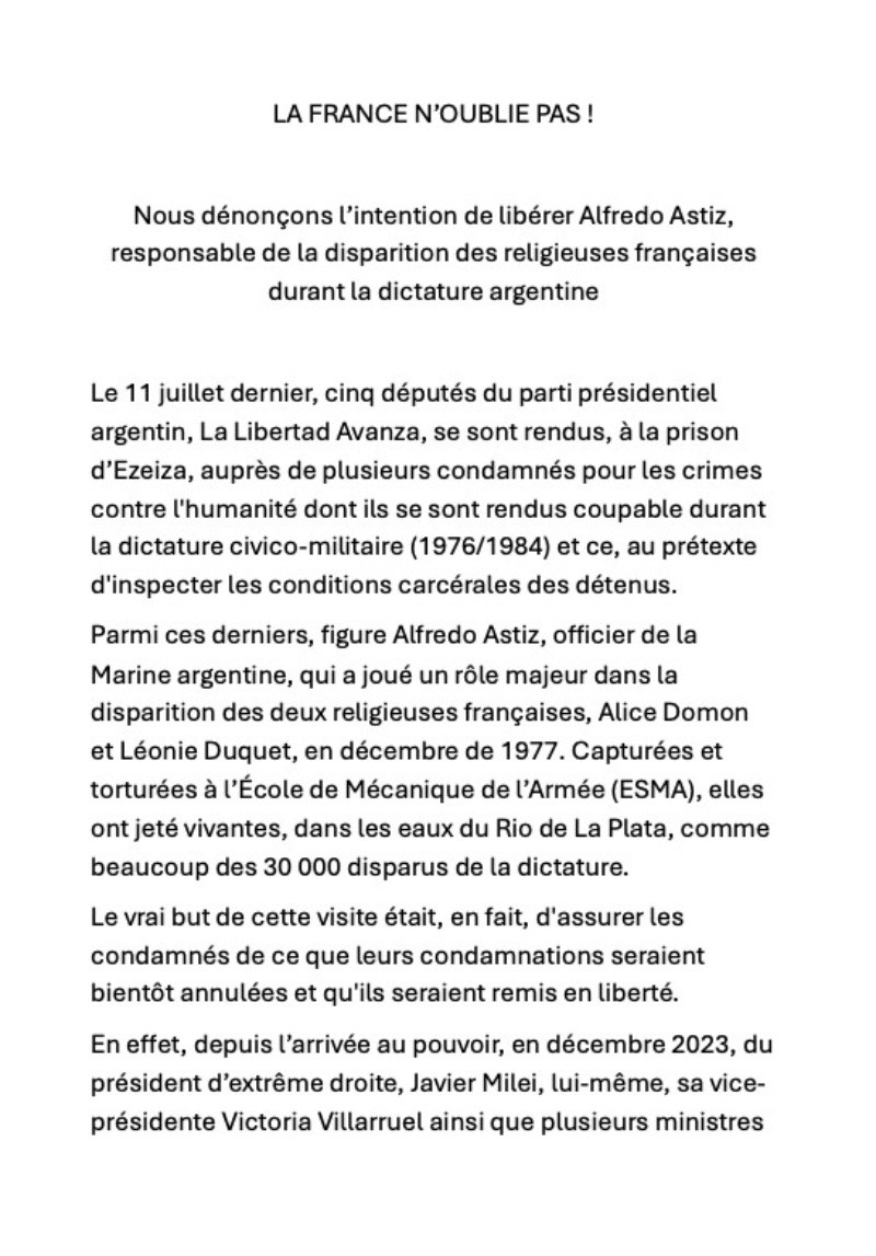 Sophie Thonon-Wesfreid, abogada de familias de franceses desaparecidos en Chile y Argentina, y Jean-Pierre Lhande, representante legal del organismo de Derechos Humanos, firmaron un texto en el que denuncian "la intención de liberar a Alfredo Astiz, responsable de la desaparición de las religiosas durante la última dictadura".