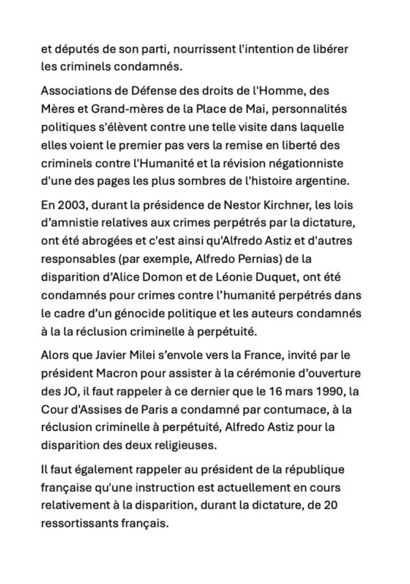 "Mientras Javier Milei vuela hacia Francia, invitado por el presidente Macron para asistir a la ceremonia de apertura de los Juegos Olímpicos, es necesario recordar a este último que el 16 de marzo de 1990, la Corte de Asís de París condenó en ausencia a Astiz a cadena perpetua", agrega.