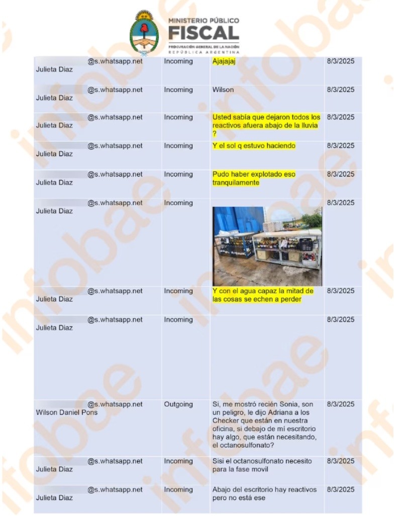 * “El análisis de los chats extraídos del dispositivo de Wilson Daniel Pons (director técnico buena parte del 2024) permite inferir que los directivos y jefes conocían inspecciones próximas, movimientos internos irregulares y ocultamiento de reactivos y solventes”.