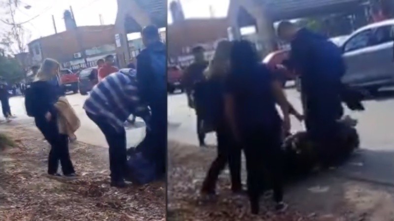 Una de ellas cae al piso y allí se produce un giro aún más violento por la patada de un muchacho que quedó en el medio del forcejeo.