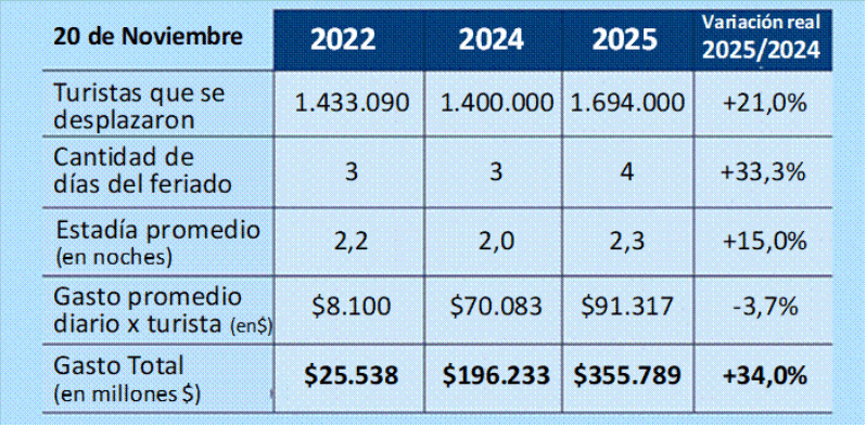 Entre enero y noviembre, los siete fines de semana largos ya movilizaron casi 12 millones de turistas y generaron $2,72 billones (equivalentes a US$1.944 millones). El impacto se sintió especialmente en las economías regionales y en miles de pymes del sector.