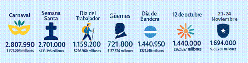 El gasto total ascendió a $355.789 millones, un 34% más en términos reales que el año pasado. La estadía media fue de 2,3 noches, un 15% superior al fin de semana del año pasado, que había tenido solo tres días.