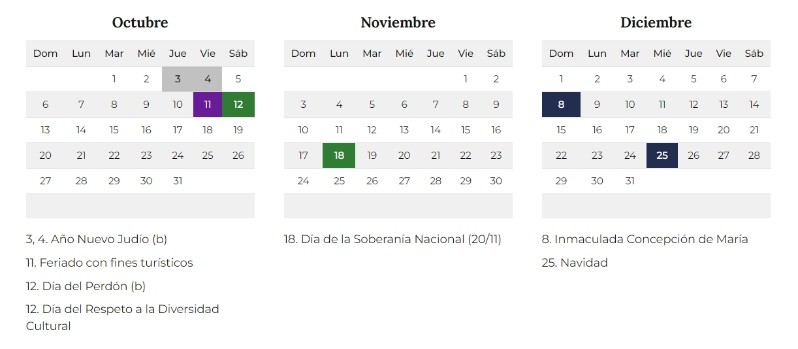 Además, en el calendario oficial el gobierno decidió sumar el viernes 11 de octubre como feriado con fines turísticos ya que permitirá a los argentinos tener un fin de semana largo.