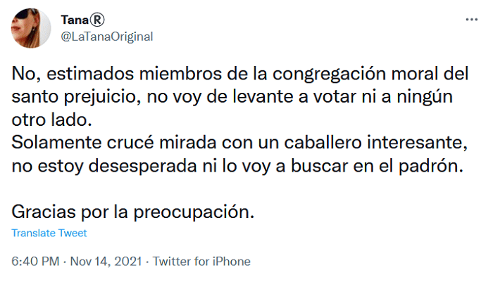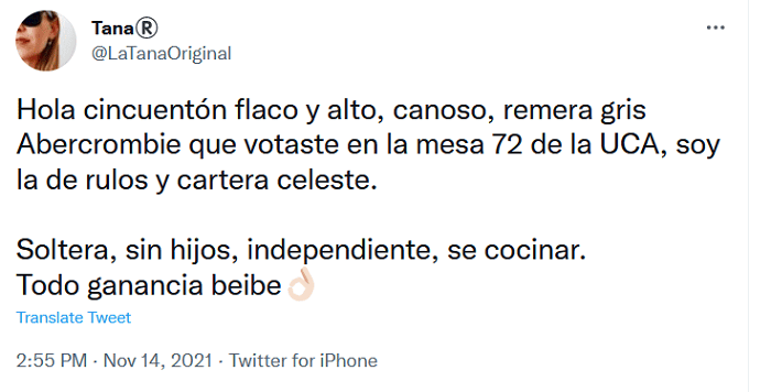 "Hola cincuentón, flaco y alto. Canoso, remera gris Abercrombie que votaste en la mesa 72 de la UCA. Soy la de rulos y cartera celeste", tuiteó desde su cuenta @LaTanaOriginal.