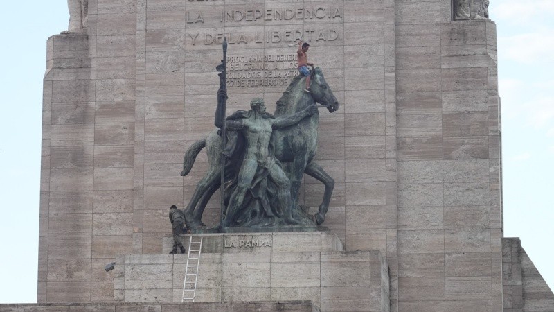 El hombre se ubicó sobre la cabeza del caballo en el grupo de esculturas de La Pampa, en uno de los laterales del Monumento obra de Alfredo Bigatti.